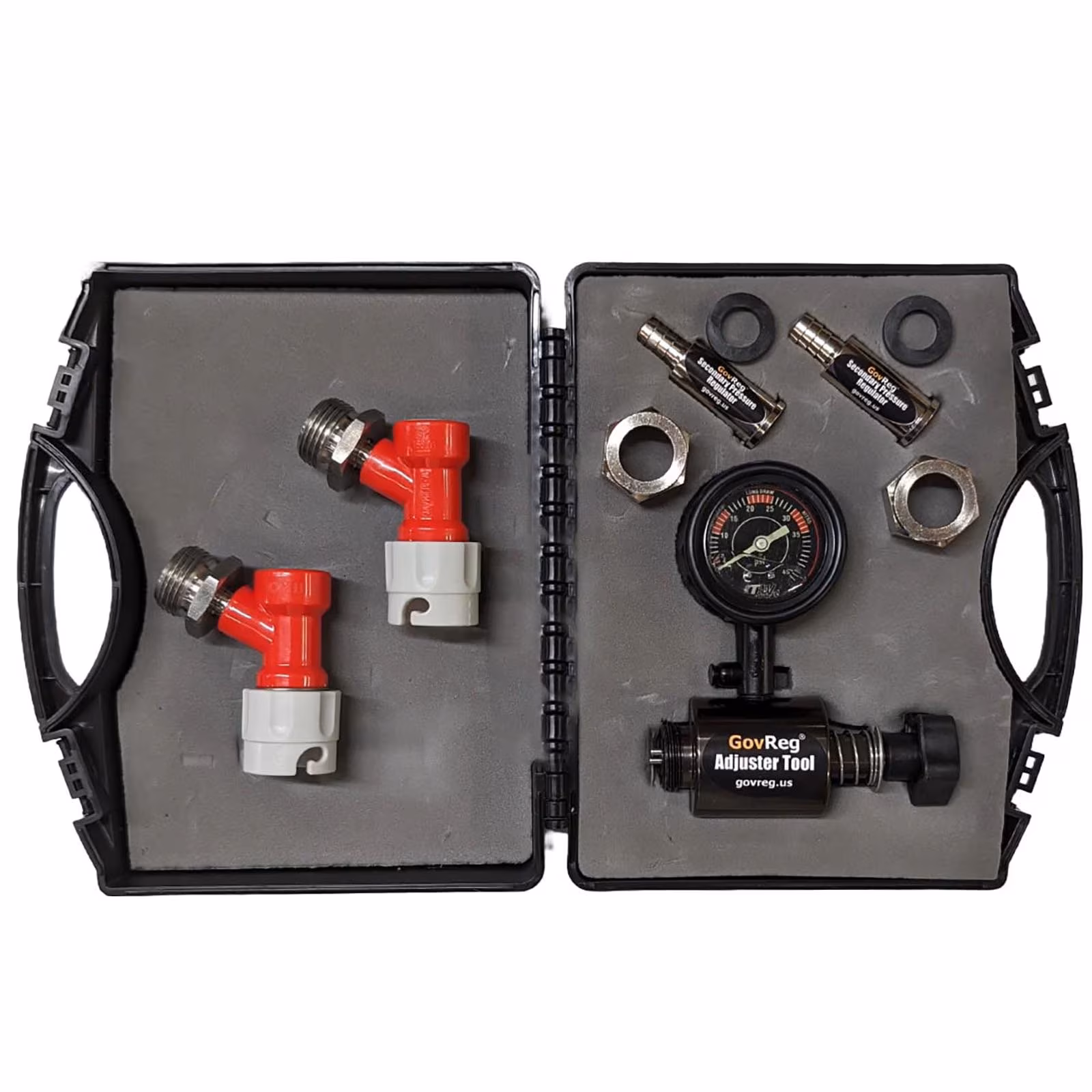Transform your beverage crafting with the GovReg® Homebrew Pin Lock Starter Kit. This comprehensive set includes everything you need to elevate your brewing process, featuring two GovReg® inline secondary pressure regulators, a specialized adjuster tool, and CMB ball lock disconnects.